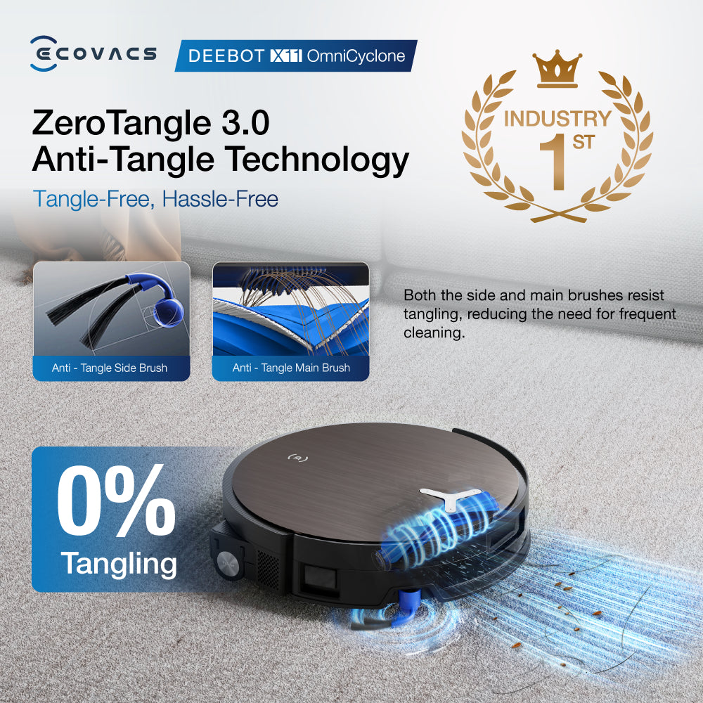 β ECOVACS' advanced dual-brush systemβfeaturing an ARClean Side Brush and a Cyclone-Directed Roller Brushβguarantees 100% tangle-free operation. No more hair wrapping. On the main brush, a Triple-V structure and spiral-comb integration actively repel and untangle hair strandsβensuring uninterrupted cleaning and minimal maintenance.